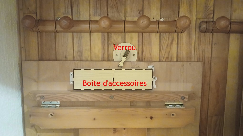 Elle peut sans problème passer le temps du séjour dehors, mais doit, au moment du départ, être pliée & remisée dans le couloir, sous les patères. Un verrou vissé sous les patères l’empêche de tomber.